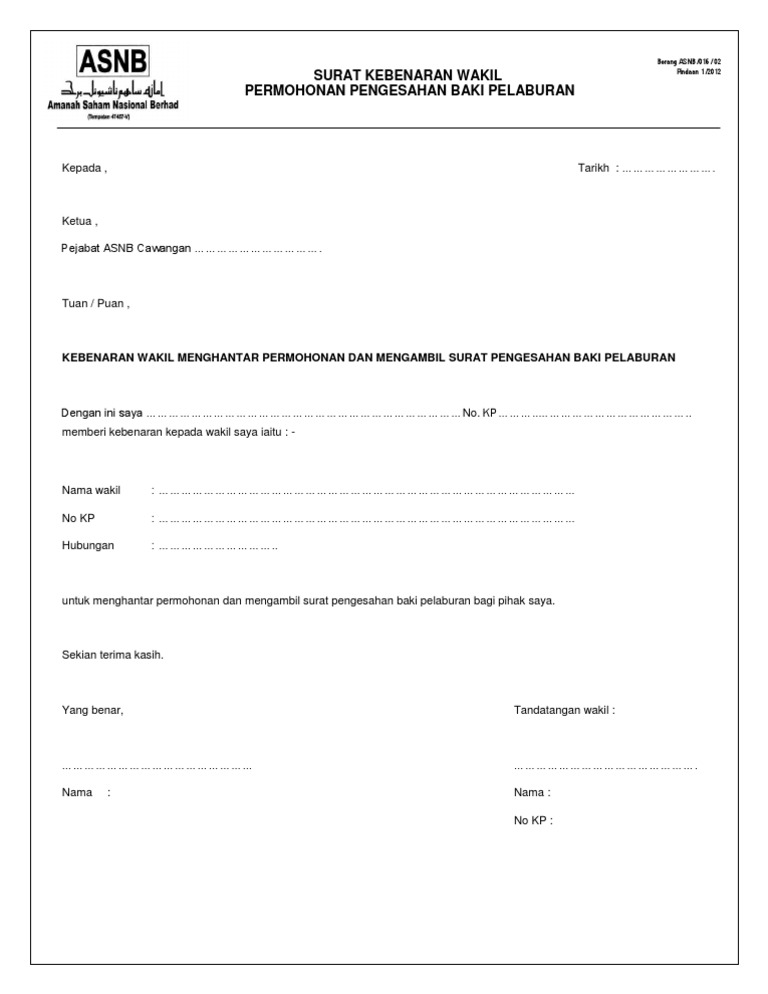 . Surat rasmi wakil majikan lamaran o. Contoh surat rasmi memberi kebenaran wakil. Borang ASNB 016 02 Pindaan 1 2012 SURAT KEBENARAN WAKIL PERMOHONAN PENGESAHAN BAKI PELABURAN.
